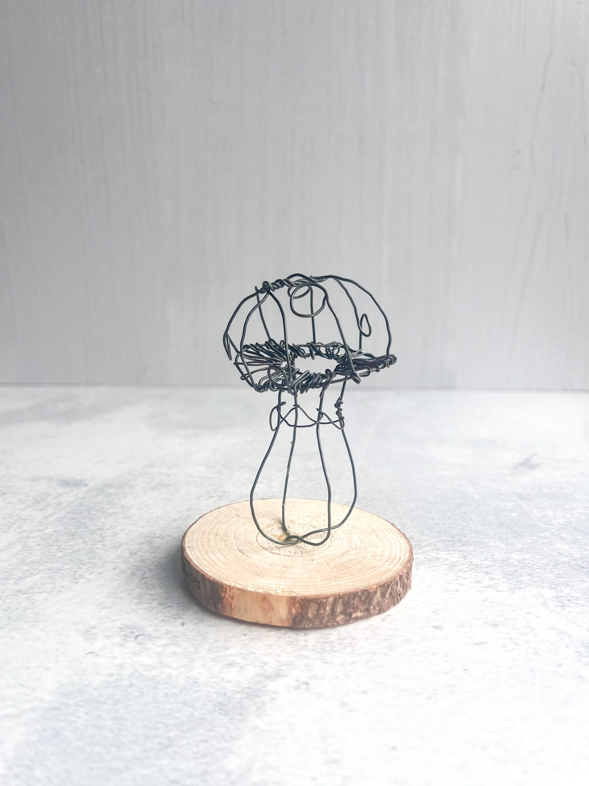 Dieser schöne Pilz ist eine komplett handgefertigte Drahtskultptur. Nur mit Draht, Zange und künstlerischem Geschick werden diese hübschen Drahtskulpturen gemacht. Für einen guten Stand wurde er auf einem kleinen Holzsockel befestigt.