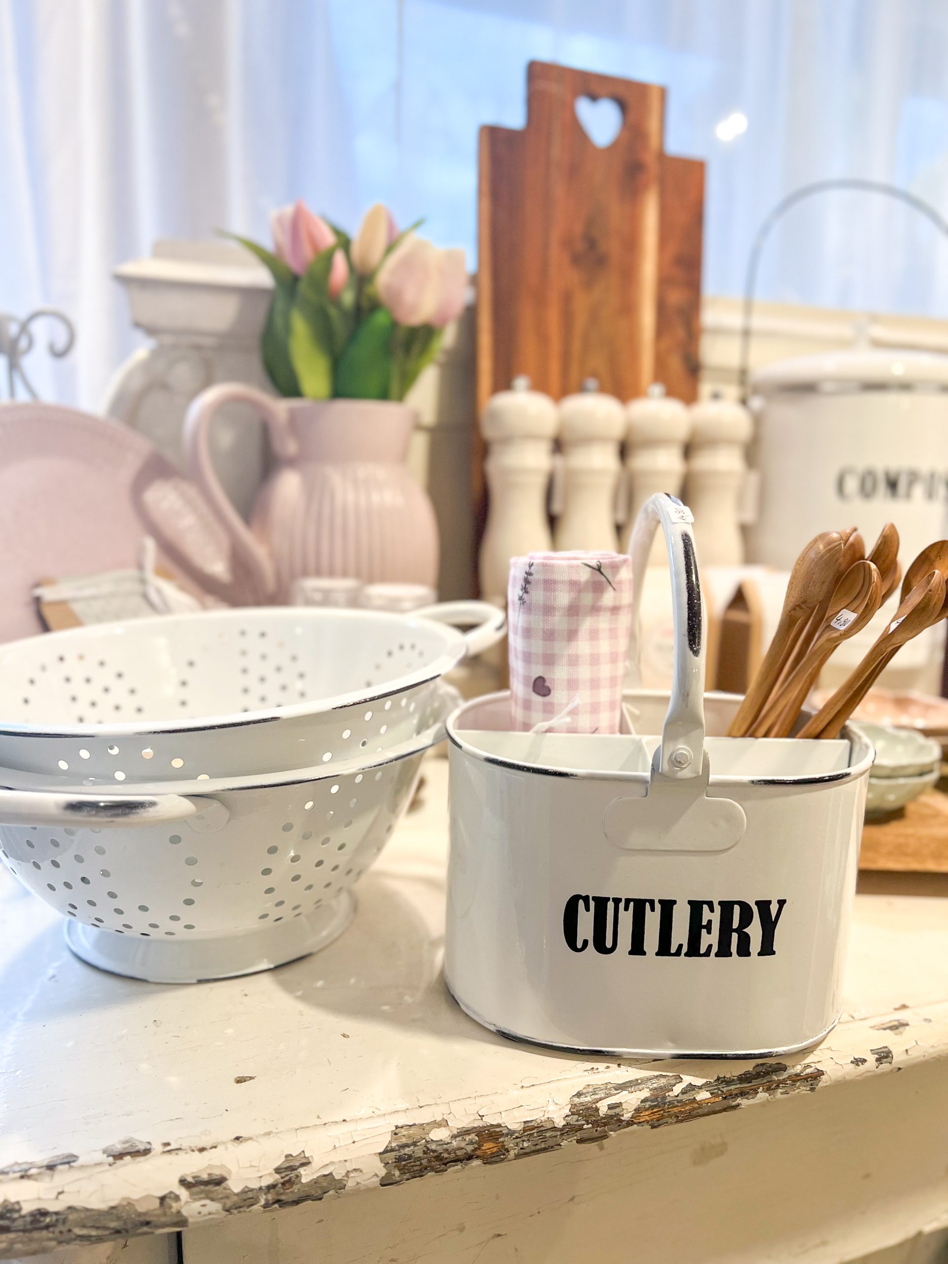 In der Küche unentbehrlich! Hübsche Seihe aus emaillierten Metallblech, perfekt für den Landhausstil.