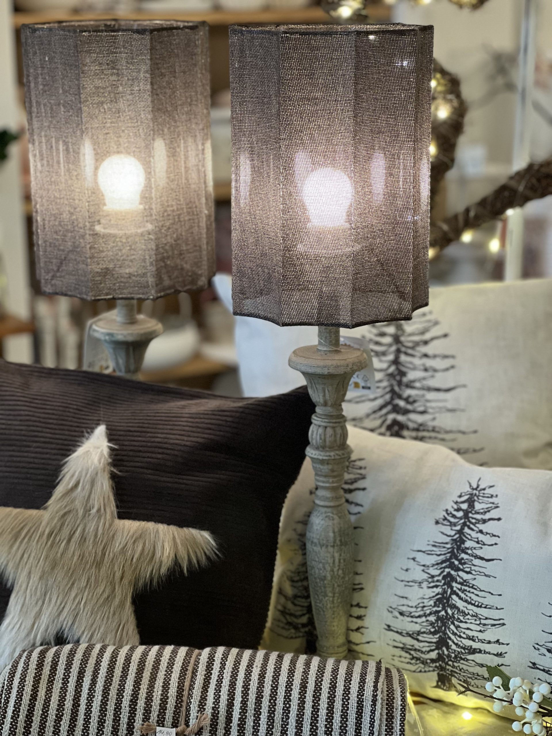Ausgefallenes Landhaus-Stück das richtige Wohlfühlatmosphäre zaubert! Lampenfuß aus Holz, Lampenschirm in in außergewöhnlicher Form, Textil in Leinenart