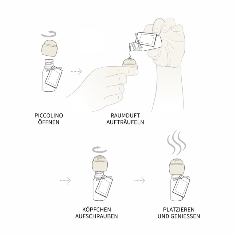 Die kurze Anleitung steht innen auf der Verpackung, so dass sich der Piccolino auch wunderbar als Geschenk eignet, mit dem du deinen Lieben einen wohltuenden Duftgenuss der Extraklasse schenkst, …denn Duft macht bekanntlich glücklich.